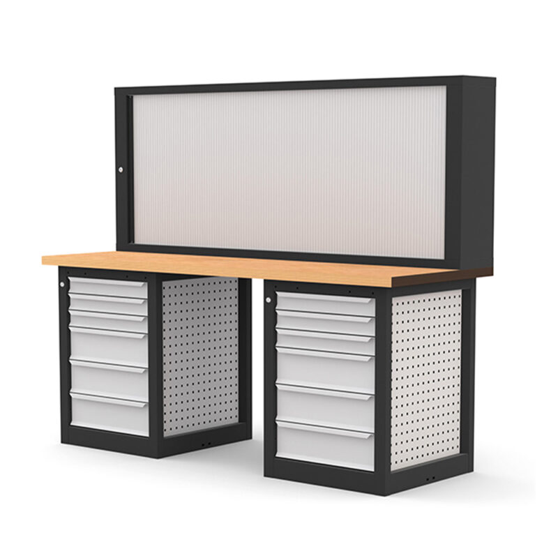 Ce modèle de kit se compose d’un plateau bois (PLAT2000), 2 meubles établis 6 tiroirs (MB6T) et 1 armoire à rideau (AR2000). Cette configuration permet de travailler grâce à la large surface de travail du plateau bois, mais également de ranger et stocker ses outils grâce aux tiroirs et panneaux perforés.